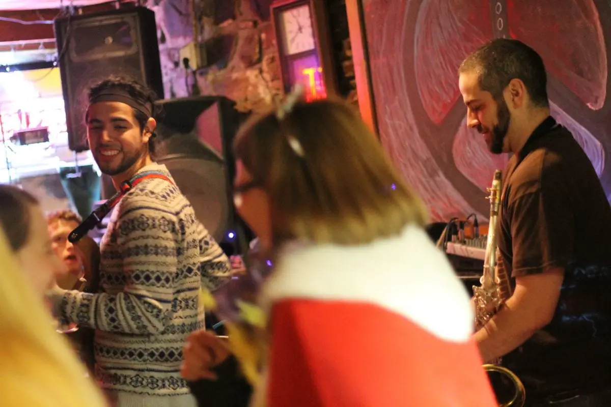 The Philadelphia-based band featured Saranac Lake native Mike LaBombard on saxophone and keys, along with Rodrigo Pichardo on bass and Aaron Zarrow on drums. The band played a free show in the Waterhole’s downstairs bar area, and it was packed with revelers honoring the outset of the weeklong winter festival, one of the oldest in the U.S., which has a theme this year of the Groovy ’60s. The Carnival queen, Linda Jackson, stopped by in her robe and crown after her coronation to celebrate with her subjects.
