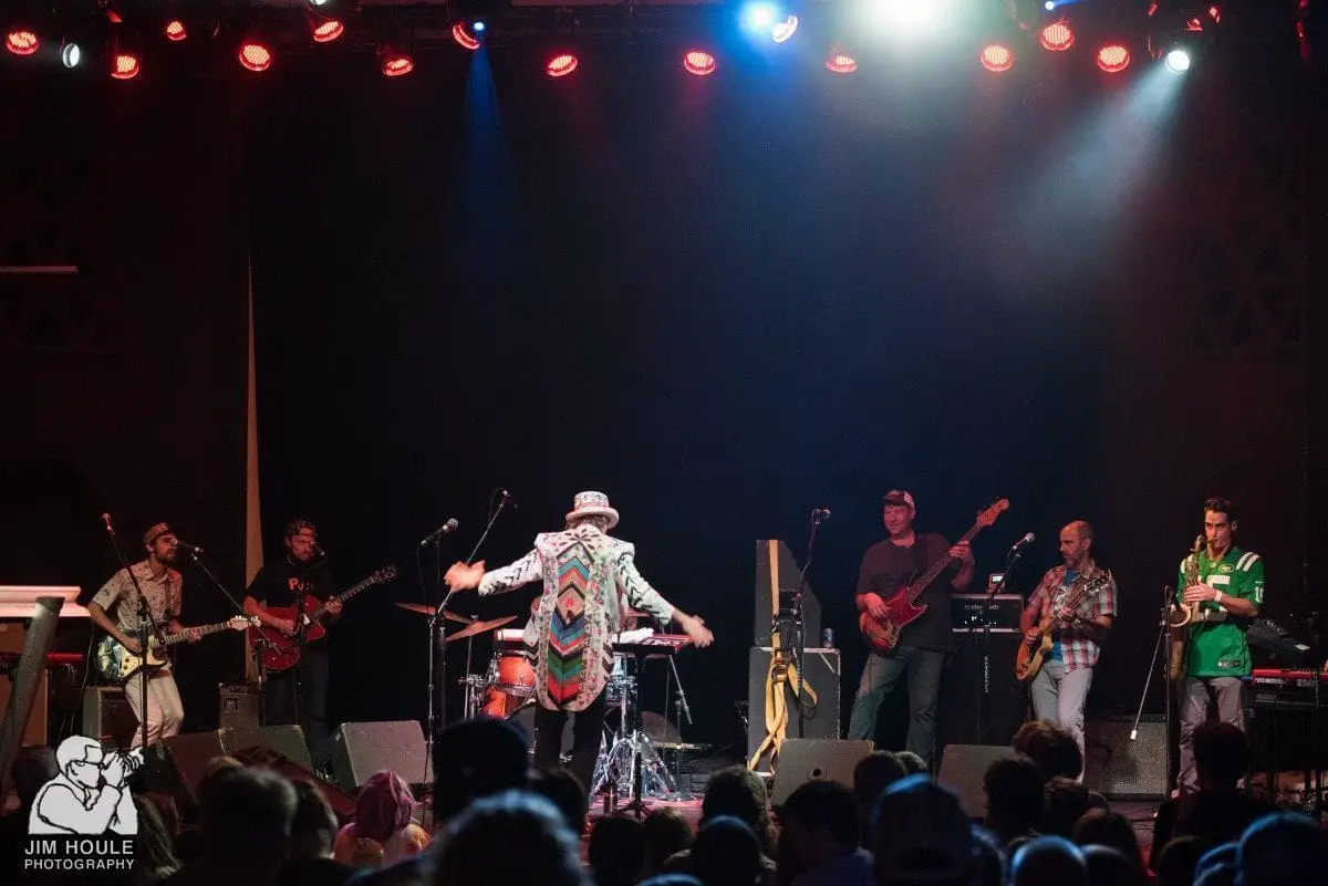 Aqueous guitarist Mike Gantzer returned to the stage and the applause grew when Butler informed us that it was his birthday. “Soft” was written on the whiteboard as Gantzer took over with a silky guitar riff. The crowd participation was at an all time high as we yelled “Birthday” to celebrate the joyous occasion. The band was fully in sync at this point in the performance and it was evident through the design of a new smash hit “Hotel Party” which Montbleau creatively developed before our eyes. “There’s ice in the bathtub” and “Everyone’s invited” were only some of the outstanding sporadic lyrics sung by Montbleau which brought a collective smile to the room. Gantzer channeled the energy of Jerry Garcia, with a liquid fuzz distortion on his incredible solo before Gold killed the keys on Butler’s command. After the Holiday Inn jungle boogie, the show wrapped up in an epic formation of nine band members with the addition of David Loss from Aqueous and the return of Eric Yates on banjo. The conductor looked more like a mad scientist as he circled the stage giving each and every member one last time to shine. The evening was capped off with birthday boy Gantzer’s in-your-face knockout solo.