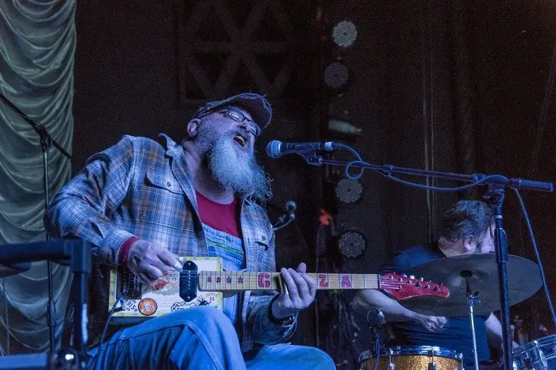 A blustery winter evening saw over two hundred music fans turn out at the Westcott Theater in Syracuse, New York for a double bill of Judge Gazza and headliner Samantha Fish. Both of these artists held surprises for anyone expecting straight ahead blues music. Gazza is a ubiquitous presence at Central New York live music events, supporting his fellow artists and promoting future shows. A burly, barrel-chested man with some prominent chin whiskers, he opened the show accompanied by Joel Reissig on drums. Gazza played slide and finger-picking style on a colorful folk art style cigar box guitar decorated with his name on the fretboard. His vocals were a gruff, gravel-throated sound that took some getting used to, but fit well with a number of the more aggressive tunes in a spectrum that drew from from Mississippi hill country blues to punk rock. Overall, his set was reminiscent of everything from Social Distortion and the White Stripes to Sleepy John Estes and R. L. Burnside, whose “Poor Black Mattie” was covered by Gazza.