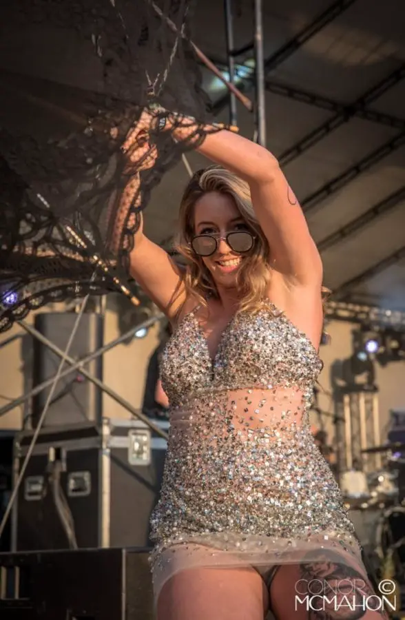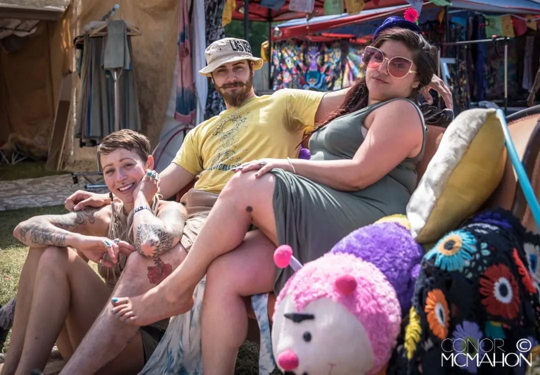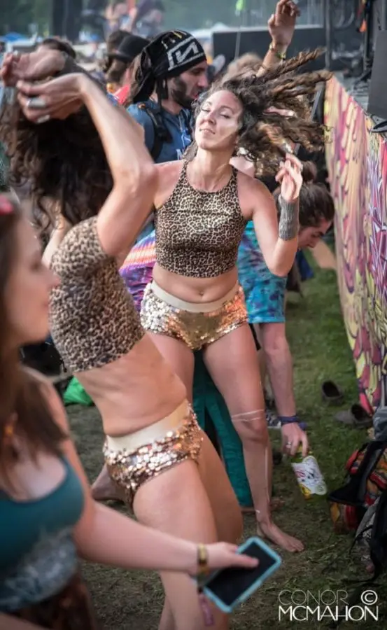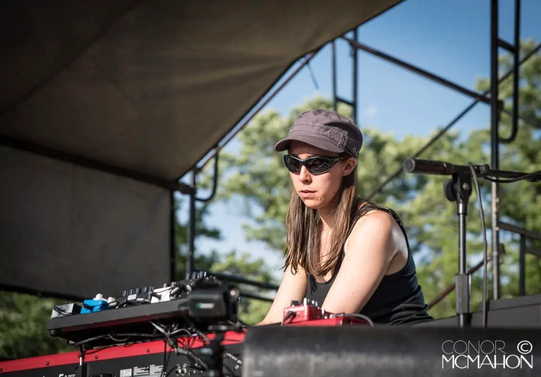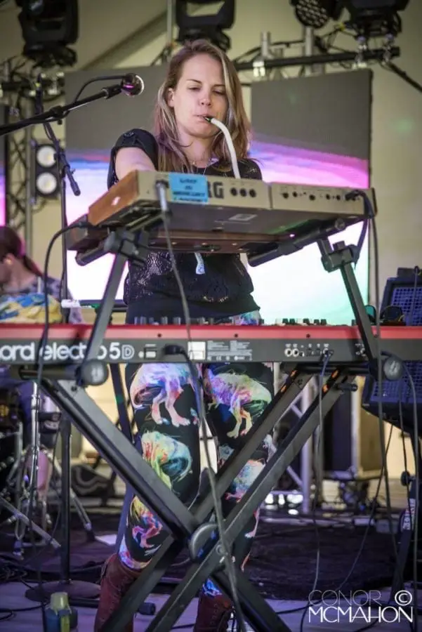 As the sun sweltered above, thousands of people crammed the box office gates early on Thursday, but soon dissipated as they began unloading their campsites. Whether it was the warm breeze in the air or the serene cow pasture in plain view, there didn’t seem to be any tension as people unloaded their bags. Most attendees set up shop long before the music began and took some quality time to unwind from whatever expedition they came from. Before the live music began, music was amplified from several campsite speakers, somehow blending together in a fine fashion. The Mushroom Cloud was first to play the Main Stage at 2 pm with some explosive funk rock to warm up bodies for a long weekend of dance. Shortly after came the enticing “prog-uke” eruption of Brooklyn-based (and 87/90 featured) band Cousin Earth. Despite some initial sound snafus, the five member band kicked off their set with “Womp”, a driving rhythmic jam to compliment each introduced instrument. Cousin Earth also performed tracks off of their newly released album Human Music, such as the party pump-up “Alive,” the molasses-smooth track “Super Fun Laser Beams” featuring tight vocal harmonies, and the classic dance track “I Got This.” Despite a rather short set, it was clear that wandering attendees moved in waves to the Tent Stage, and Cousin Earth commanded their audience with fresh ideas and instruments to keep the sound moving and layered.