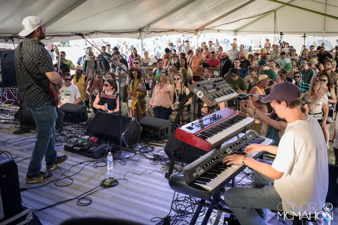 After Moon Hooch closed up the Main Stage for the night, music would not stop there. Over in the Tent Stage, the show was just beginning as the entire audience from Moon Hooch drifted over to the smaller stage as Twiddle members Zdenek Gubb and Mihali Savoulidis played an acoustic set under the alias Gubbulidis. In addition to their music as a side project, the two never shy away from performing Twiddle tunes like “Apples,” the relaxing remedy “Syncopated Healing” and “White Light” from the full group’s PLUMP album. While the hours passed into the early morning, people grew weary of the acoustic sets that followed, but many stuck around to see the night finally close with a combo set of Rob Compa and Aqueous guitarist Mike Gantzer.
