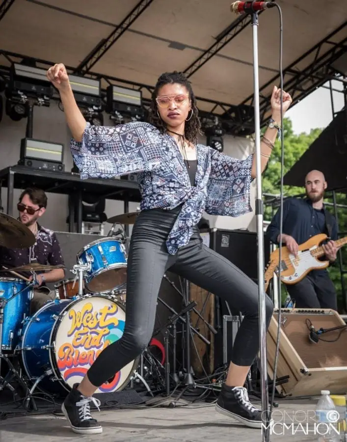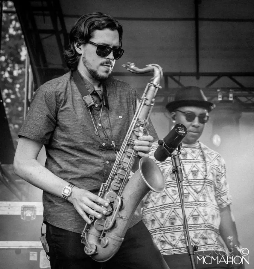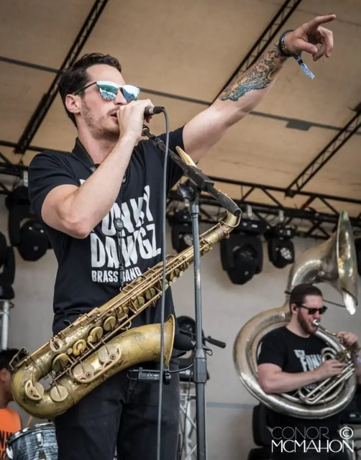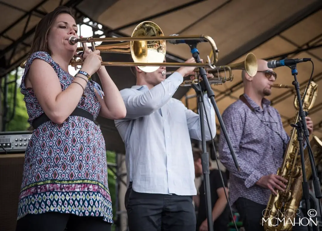 In their first visit to the Disc Jam stage, Big Mean Sound Machine greeted the new day with a booming brass resonance from its nine members. They performed “Seeing the Bigger Picture” from their 2017 release Runnin’ for the Ghost and the pulsing piece “In the Name of What?” from their 2014 album Contraband.