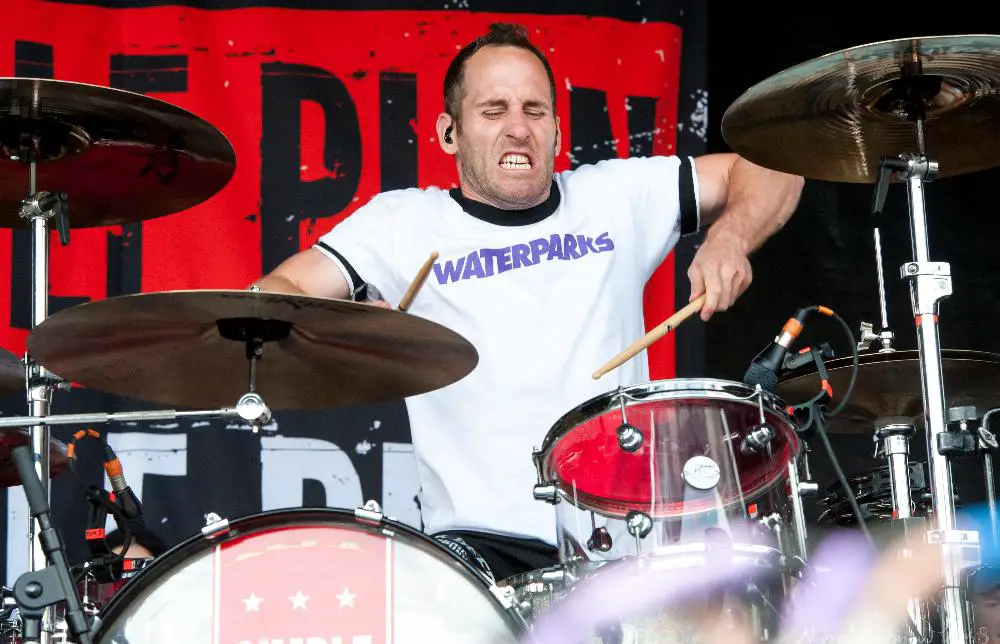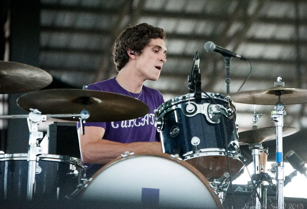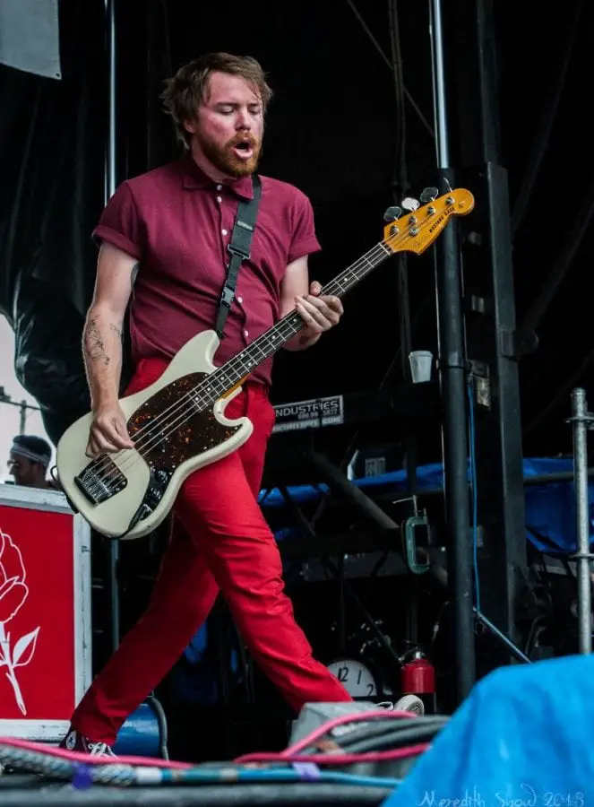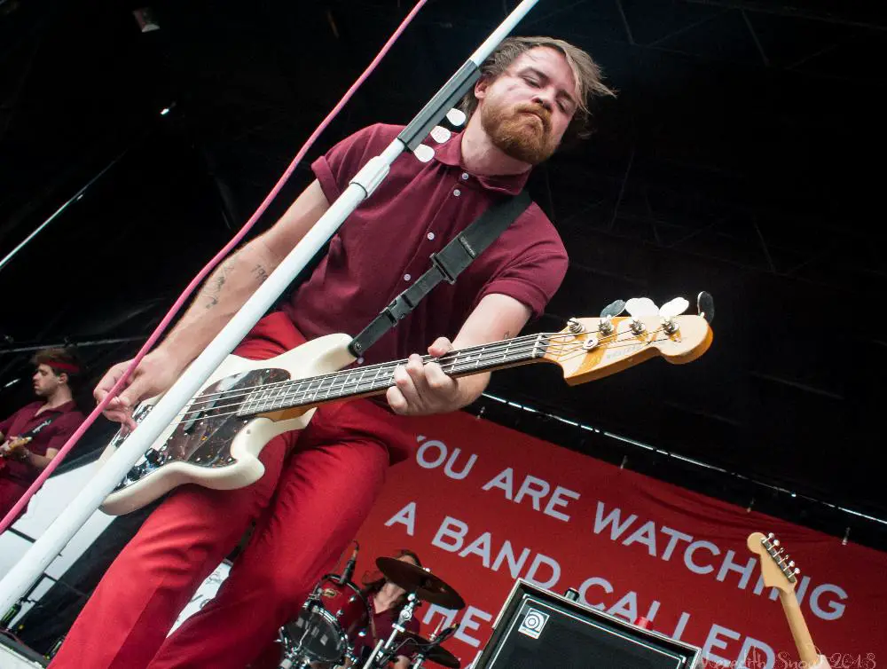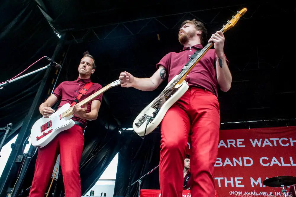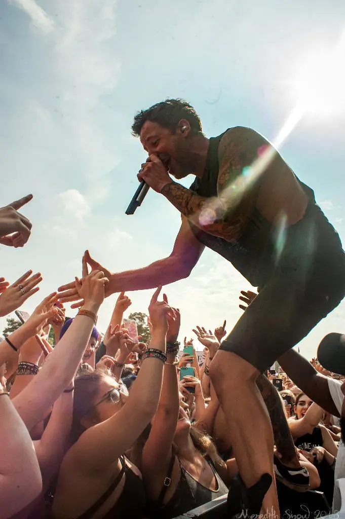 Then we were off to see The Maine. A whooshing sound filled the air as they filed on stage in their signature matching outfits. They started with a cover of Blur’s “Song 2” which got the crowd singing along. The rest of their set was all originals from their eleven years as a band. On “Girls Do What They Want,” they called a random audience member up on stage to help sing the song. This guy Brian came up in his tank top and shorts and made the most of his five minutes of fame, nailing the lyrics and vocals.
