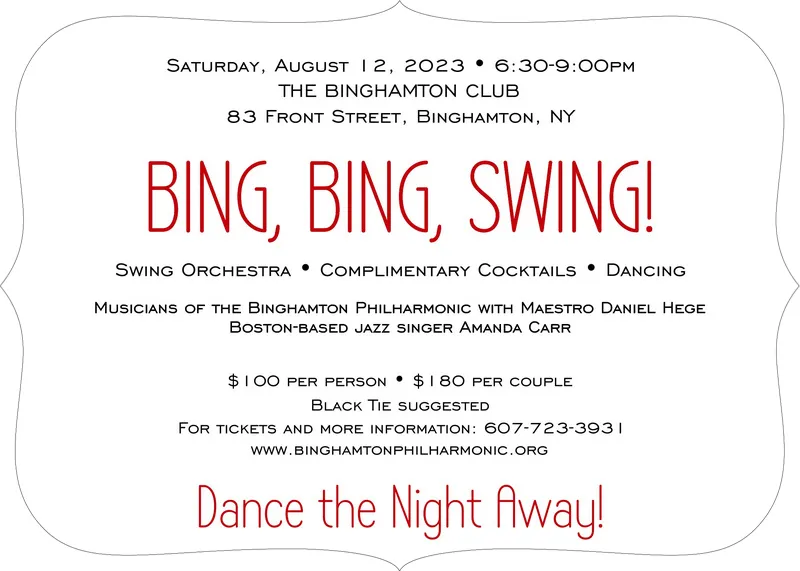 The Binghamton Philharmonic Orchestra has announced its first annual “Bing, Bing, Swing,” event, a live swing orchestra gala that will take place on August 12 at The Binghamton Club.
