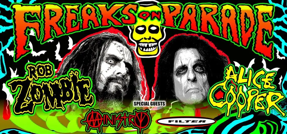 Dubbed the Gruesome Twosome when Alice Cooper and Rob Zombie toured together 13 years ago, the pair have reunited for their Freaks on Parade 2023 co-headlining tour that brought them to the Jones Beach Theater in Wantagh, NY this past Saturday, September 9, for another haunted hell ride. Joined by industrial pioneers Ministry and the eclectic alternative rockers Filter, these special guests have opened every show on the massive, 38-date trek of North America.