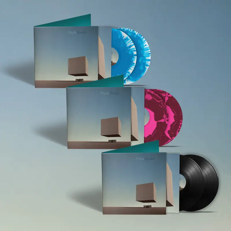 Phish Dry Goods has three different exclusive pressings of Evolve available for pre-order, including a “Crimson Robed Edition” (neon-pink/maroon colored wax), “Pillow Jets Edition” (transparent/blue colored wax), and an “Eco-Onyx Gates” 180g Audiophile Edition pressed on recycled eco-black wax. T-shirts, CDs, and hats are also available.