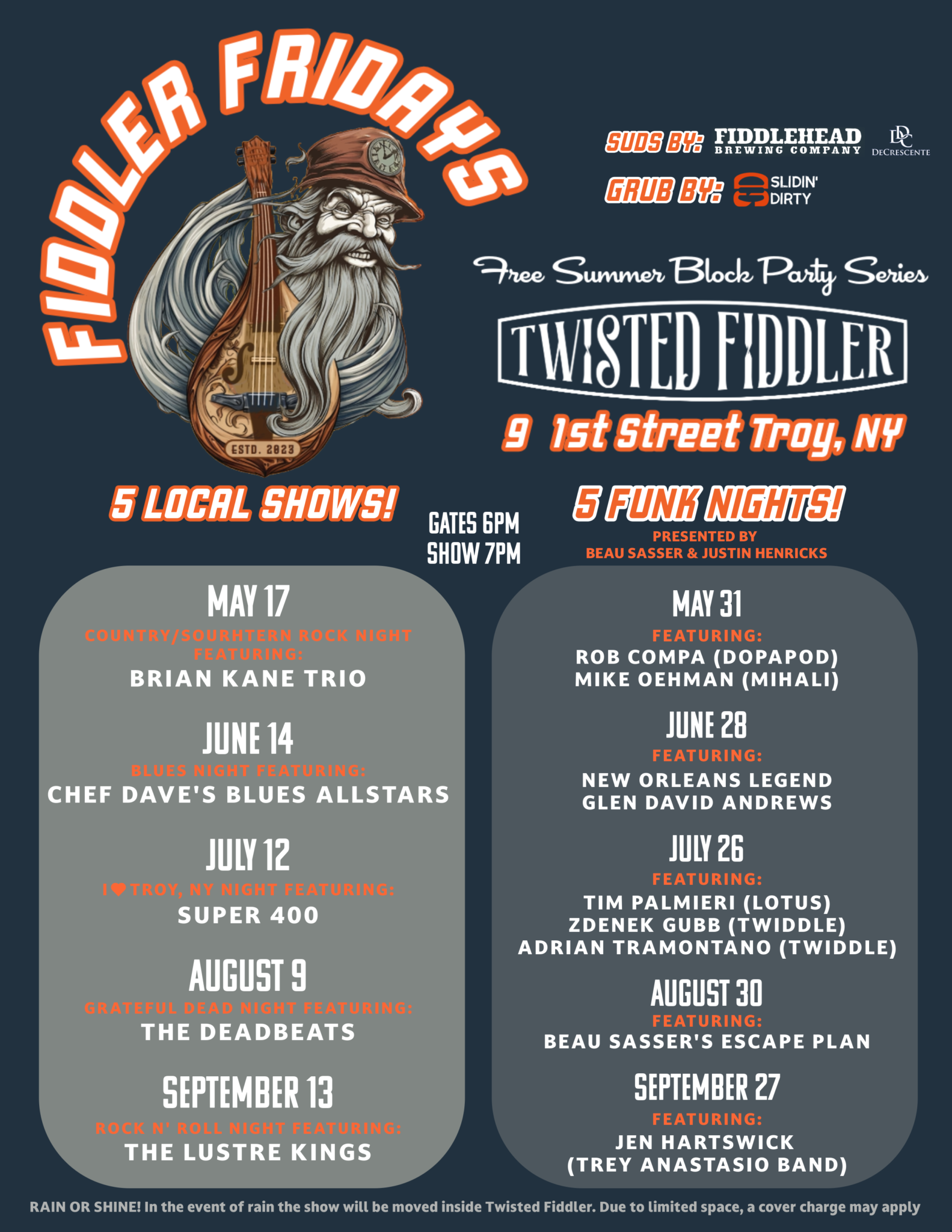 Starting Friday May 17, live music tavern Twisted Fiddler is hosting 10 Free Friday Night Summer Block Parties at 9 First Street in Troy with outdoor live music, a beer truck and food from the famous Slidin’ Dirty food truck. The Summer Concert Series features top jam and funk artists on weekly “Fiddler Fridays” for 10 Friday nights, May through September, from 7-10 p.m.