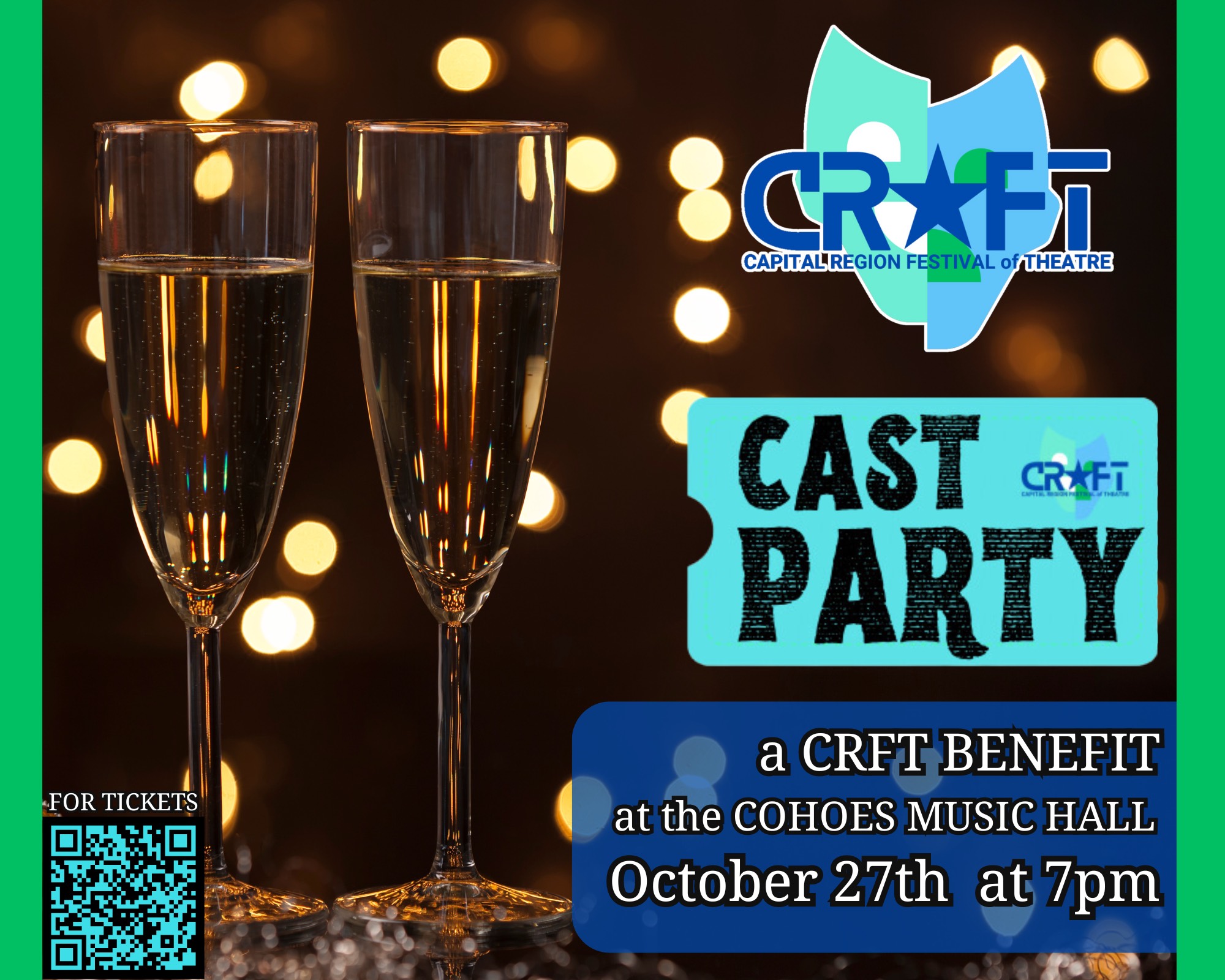Cohoes Music Hall announced that on October 27 the venue will host a grand Cast Party to raise funds for the inaugural Capital Region Festival of Theatre. The party is presented by Playhouse Stage Company.