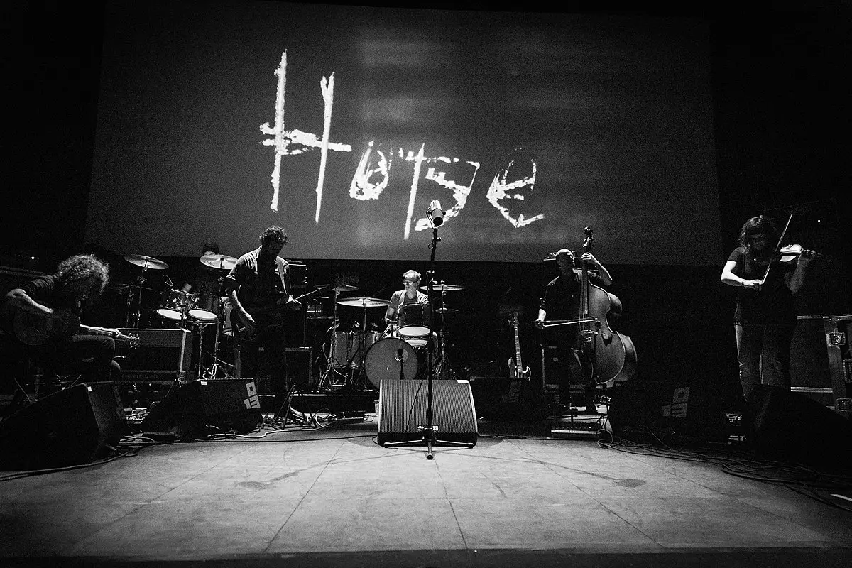 The show opens in almost total darkness. The band filters out onto stage one by one, opening, as always, with the improvised ‘Hope Drone’. A twitching message, written in cursive, flickers all too briefly on a screen behind the band: “hope”.