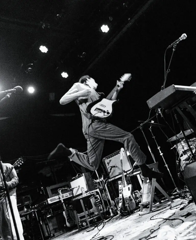 It’s at this point where my attention was drawn to the simultaneously simplistic yet clearly well-articulated set dressing. With a large plush carpet beneath their feet and stacked amps next to the occasional unassuming wooden stool, the band was lit both by the gauzy stage lights and a desk lamp perched upon a small table at center stage that offered a small but cozy additional amount of honeyed light. (The design student in me would also be remiss to not mention that the lamp appeared to be an Emeralite, colloquially known as the “Bankers Lamp,” designed by Harrison D. McFaddin in 1909. The lamp is iconic within the film and television industry- entire forums are dedicated to the countless times it can be spotted throughout some of modern media’s biggest productions and franchises!)
