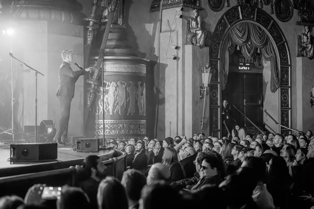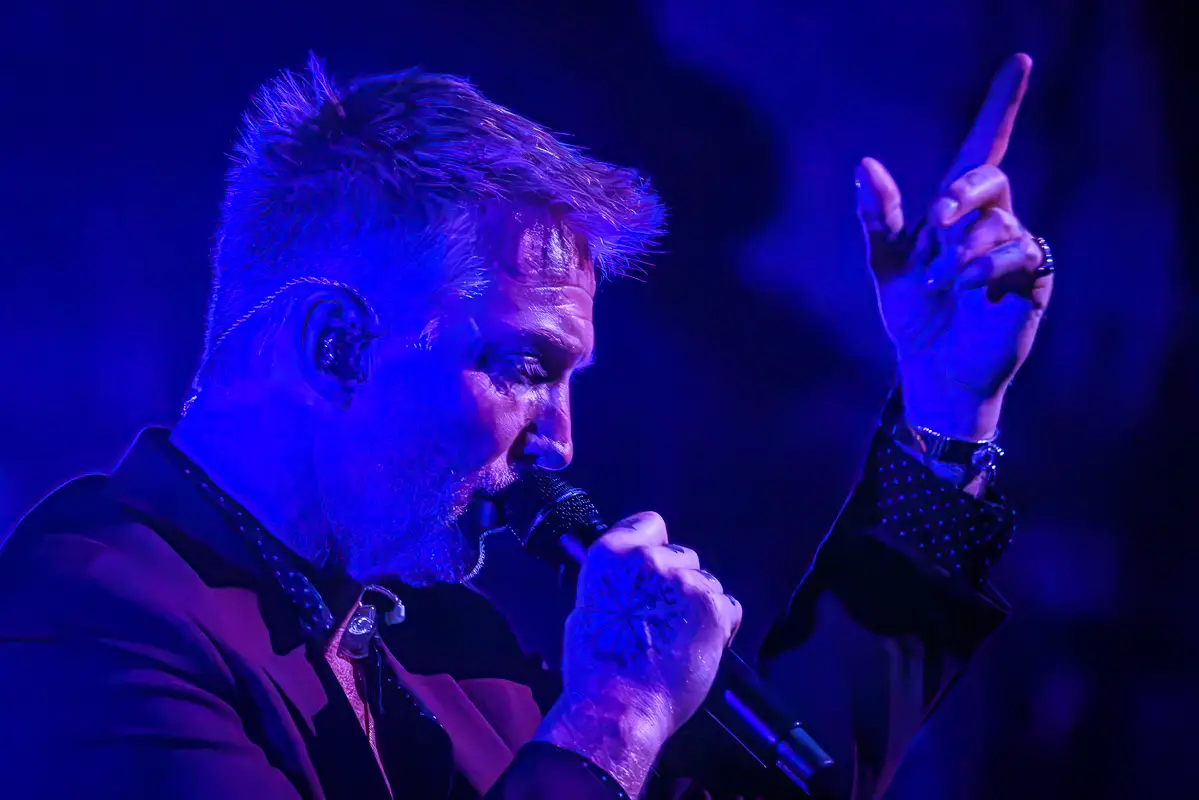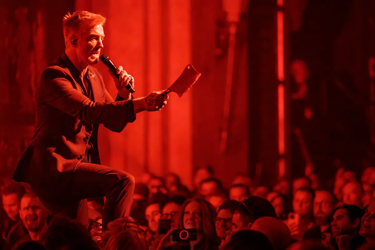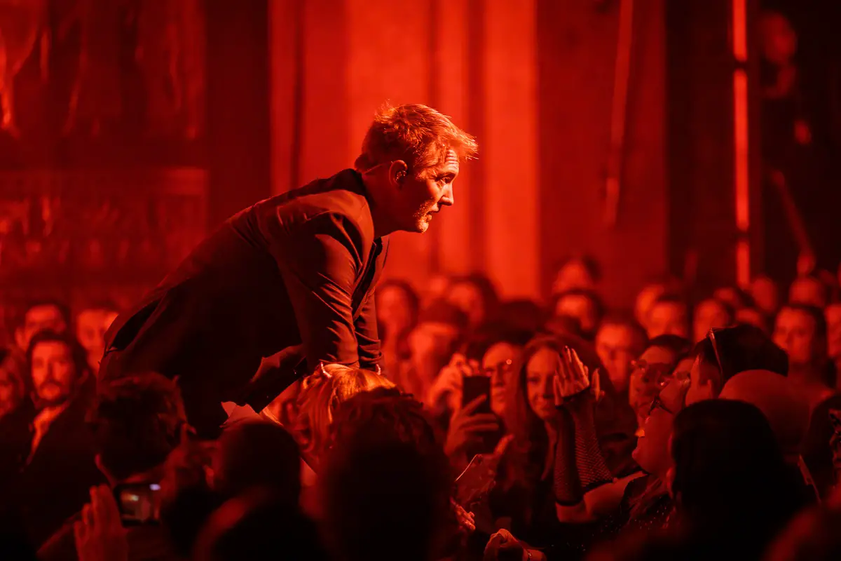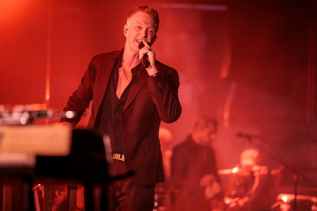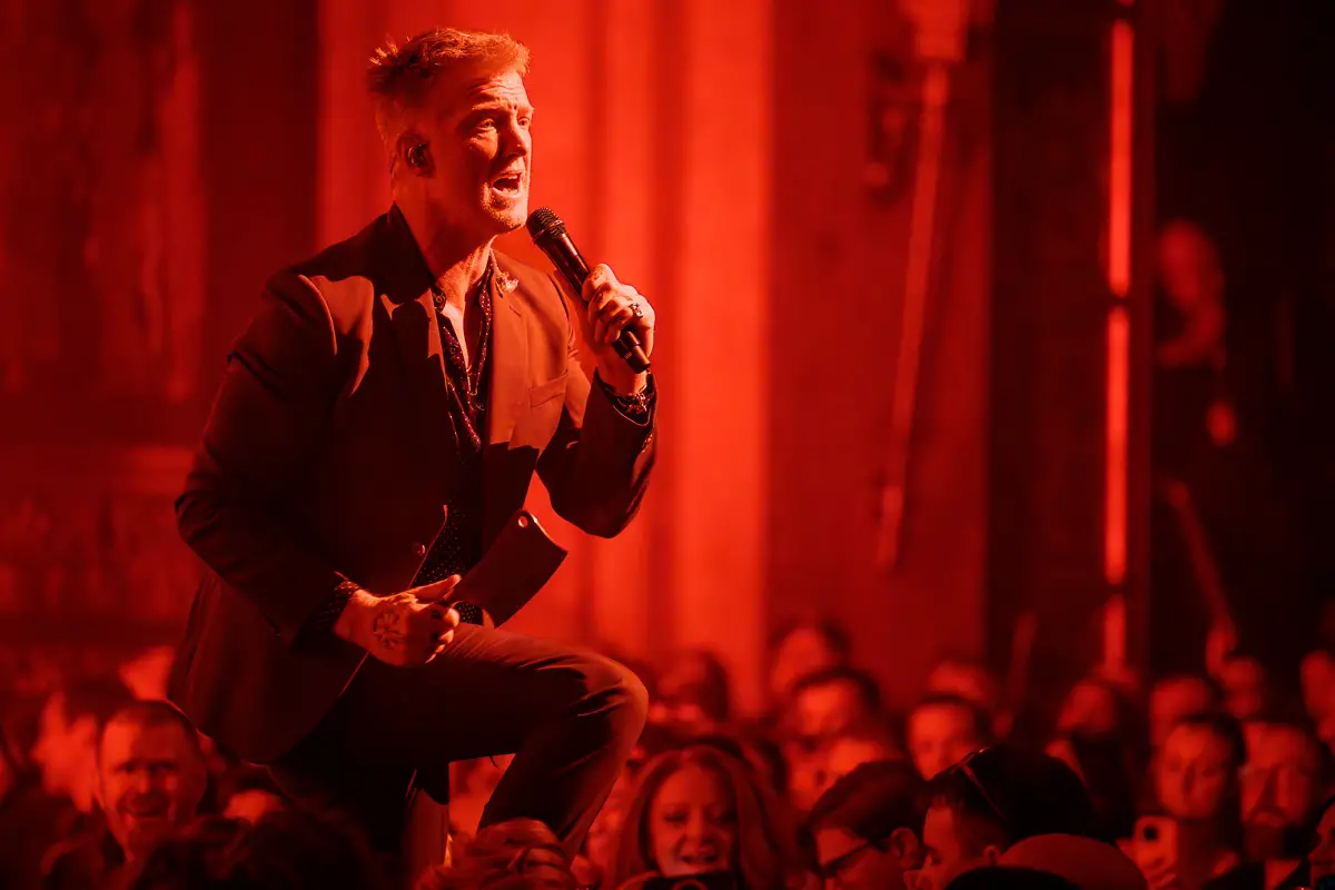 When the lights dimmed for QOTSA, the room fell silent. The first act began in total darkness with a slow, atmospheric rise into “Running Joke.” Josh Homme appeared in the blue light, swinging a warm light as he sang. The band and a string trio joined in. The sequence of five songs – all drawn from Alive in the Catacombs – transformed the ornate Beacon into a shadowy, subterranean space pulsing with ambient sound and tension.