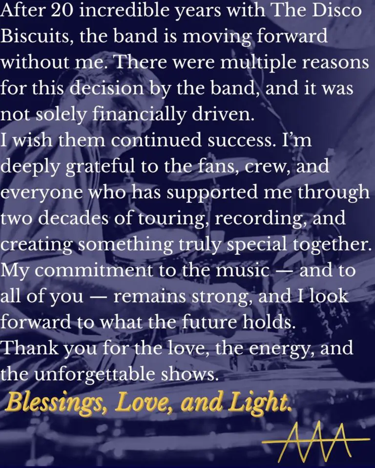 “After 20 incredible years with the Disco Biscuits, the band is moving forward without me. There were multiple reasons for this decision by the band, and it was not solely financially driven.