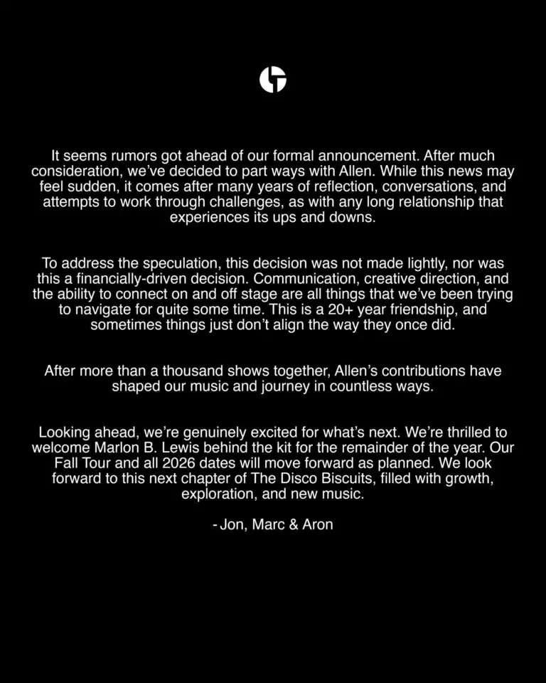 Looking ahead, we’re genuinely excited for what’s next. We’re thrilled to welcome Marlon B. Lewis behind the kit for the remainder of the year. Our Fall Tour and all 2026 dates will move forward as planned. We look forward to this next chapter of The Disco Biscuits, filled with growth, exploration, and new music.“