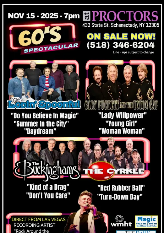 The Capital Region will host a night of legendary performances. On Saturday, November 15, at 7:00 p.m., the Proctors Theatre is holding the Star-Studded 60s Spectacular, including five well known acts: Gary Puckett and The Union Gap, The Lovin’ Spoonful, The Buckinghams, The Cyrkle, and Estefano DiSanto.