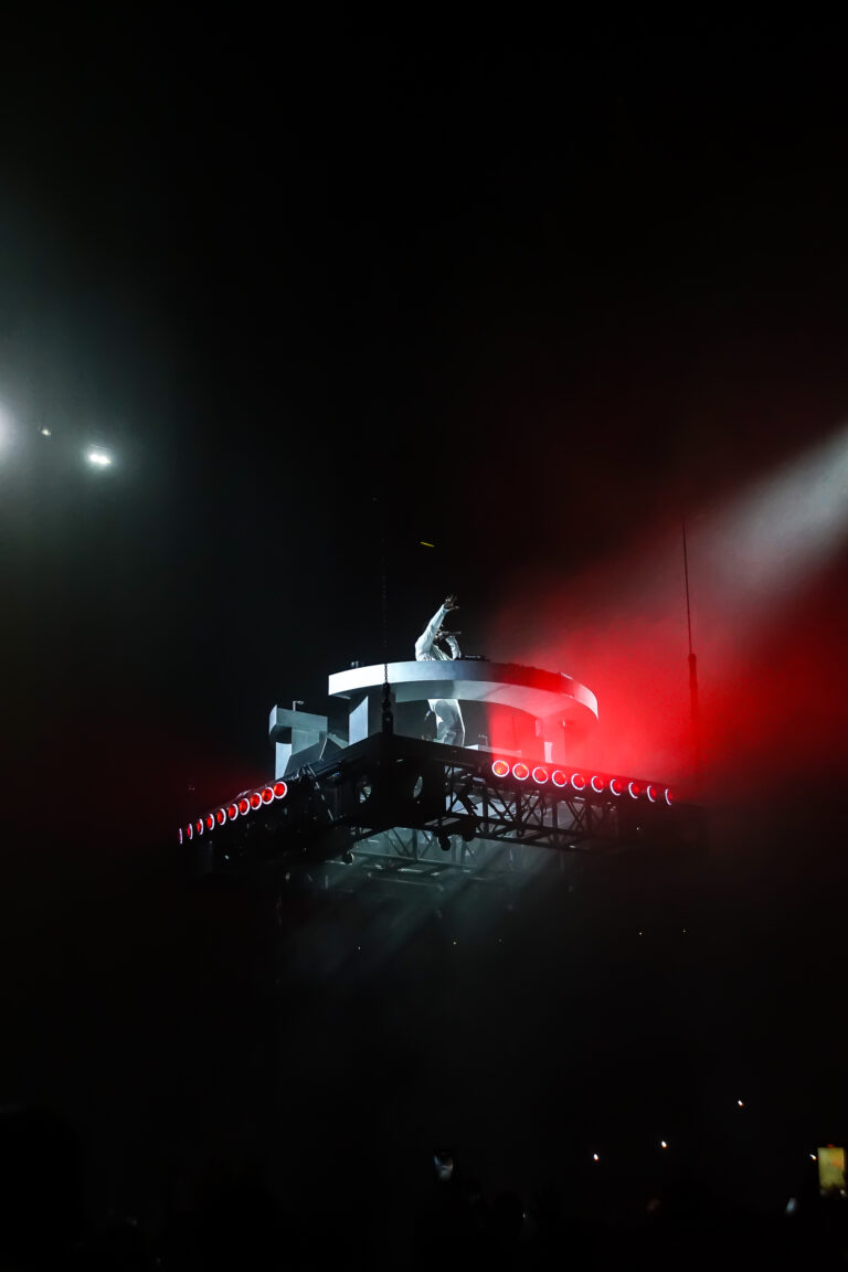 Following a quick stage reset, Justice emerged: Gaspard Augé and Xavier de Rosnay framed by their towering “×” logo and an arsenal of lights and lasers. From the very first beat, the vibe shifted: the arena felt smaller, tighter, more intense. The duo moved through a frantic, high-paced sequence of their biggest hits and newer material, lacing distorted synth lines with pounding four-on-the-floor drums and unmistakeable rock-in-the-club energy.
