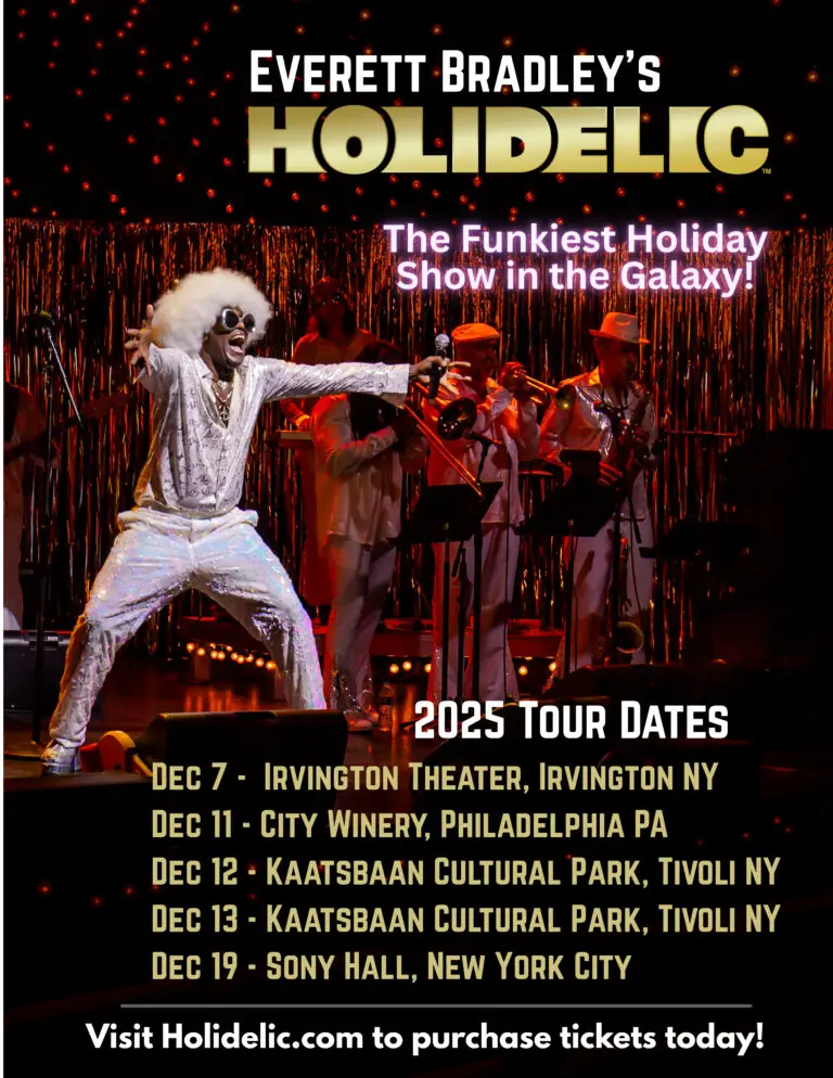 Everett Bradley’s persona Papadelic – funk’s Father Christmas – brings his funk-lore to Irvington, Philadelphia, Tivoli and NYC this holiday season with Holidelic.