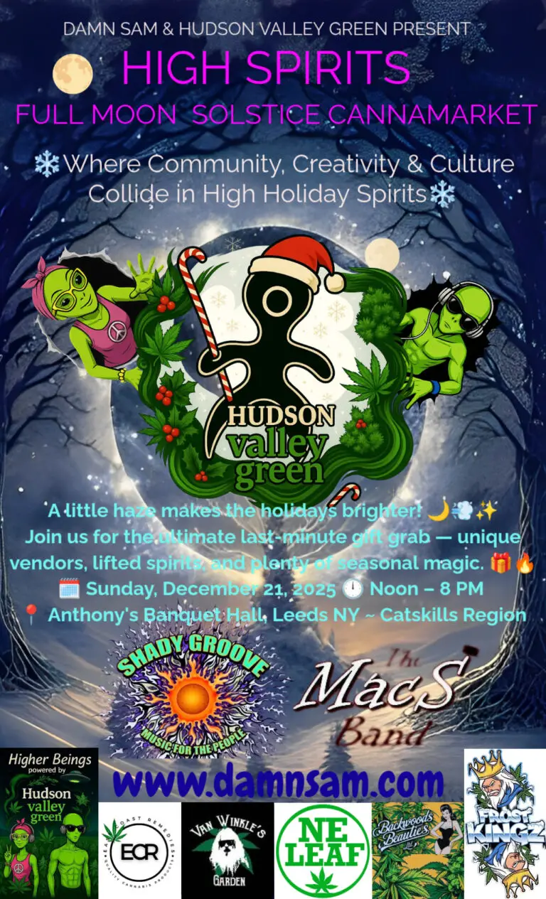 Damn Sam Productions and Hudson Valley Green have teamed up for a festive, high-vibe holiday marketplace blending community, creativity, cannabis culture, and winter wonder. This solstice celebration invites you to shop local, meet artists and cultivators and vibe out under the cosmic glow of the full moon.