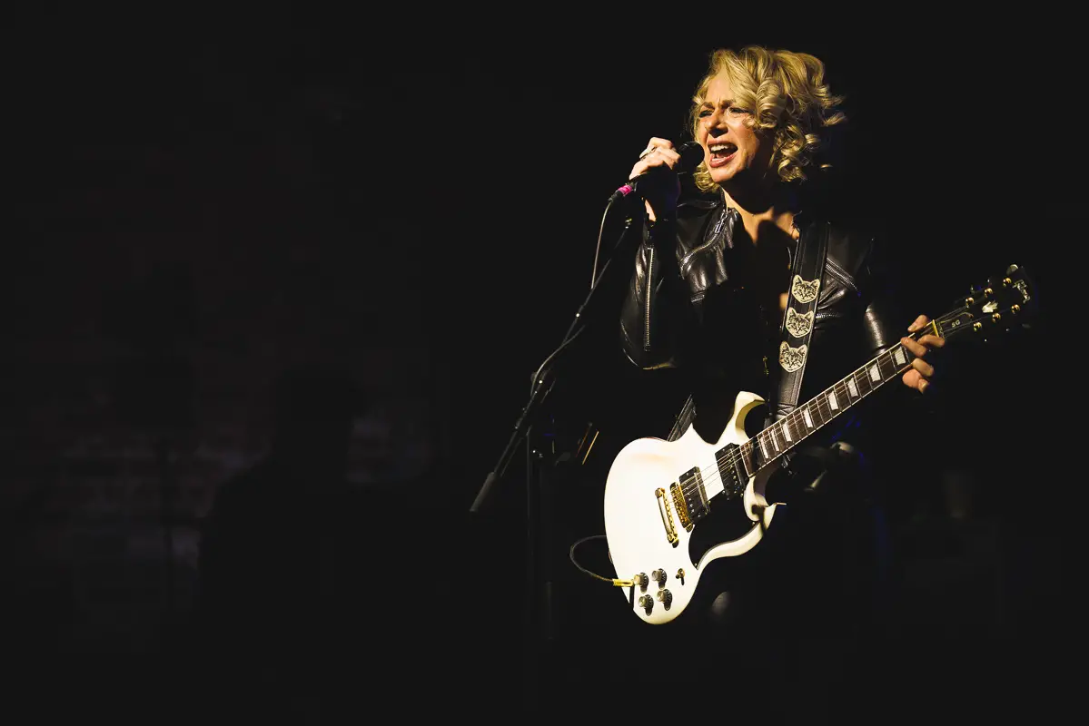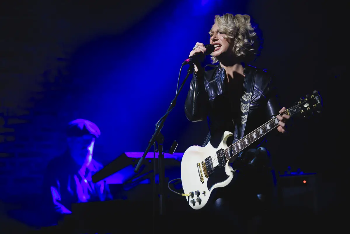 Throughout the night, Fish showcased her impressive guitar collection, switching guitars frequently. She opened with her signature white, double-humbucker Gibson SG, later bringing out a silver sparkle Gibson Custom Shop ES-335, a Flying V and several other guitars.