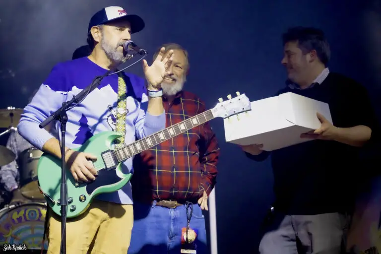 Then came the moment that turned a great show into an unforgettable one. After a brief break, guitarist Al Schnier returned to the stage for what are affectionately known as “Al.nouncements,” and invited Greg Bell out to address the crowd. Bell spoke humbly about this being his final “big” show, before moe. surprised him with a retirement cake and then balloons, each emblazoned with his face and the words “End of an Era.” It truly felt like we were witnessing one.