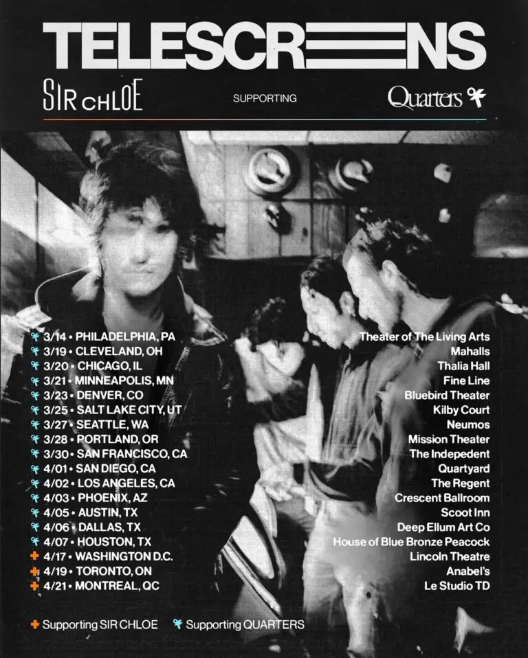 Formed in Manhattan and comprised of Jackson Hamm (vocals/guitar), Austin Brenner (bass), Josiah Valerius (keys/synth), and Oliver Graf (drums).The new single is Telescreens’ follow up to last Fall’s “Nothing” and its B-sides, “Gimme All You Got” and “Alcoholism.