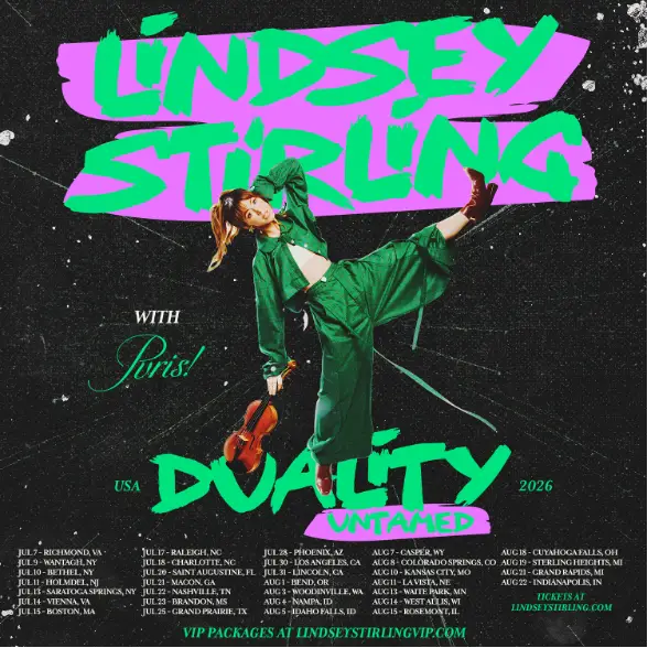 The 32-date North American tour is named after Stirling’s latest studio album, Duality, an ambitious and experimental release that continues her tradition of blending classical violin, electronic music, and cinematic visuals into an immersive live experience. The album features collaborations with Royal & the Serpent and Walk Off the Earth, and explores themes of intuition, truth, and creative contrast. One of its standout tracks, “Eye Of The Untold Her,” was notably used in Suni Lee’s gold and bronze medal–winning floor routines during the Paris Summer Olympics.