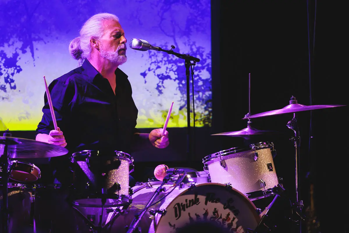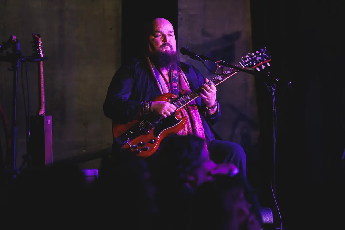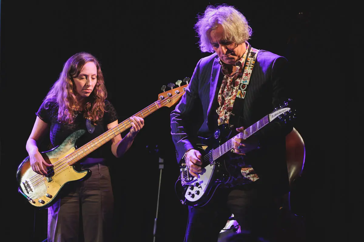 Instrumentation played a major role in shaping the immersive sound. Garwood handled lead vocals on most of the songs, his smoky tone occasionally giving way to soprano saxophone lines that shifted the emotional register without breaking momentum. Johannes rotated between an Epiphone SG, an electric oud, and, for much of the evening, a cigar box guitar. Buck alternated between a 12-string Epiphone Riviera and a Rickenbacker 360 with Bigsby vibrato. Blackwell began on electric bass before switching to an upright mid-set. Meanwhile, Martin and Garcia expanded the sonic palette with globally inspired percussion and textures: drums, vibraphone (sometimes bowed to create an eerie, voice-like tone), tambourine, shakers, chimes, kalimba and more. At one point, they even asked the audience to clap to the beat.