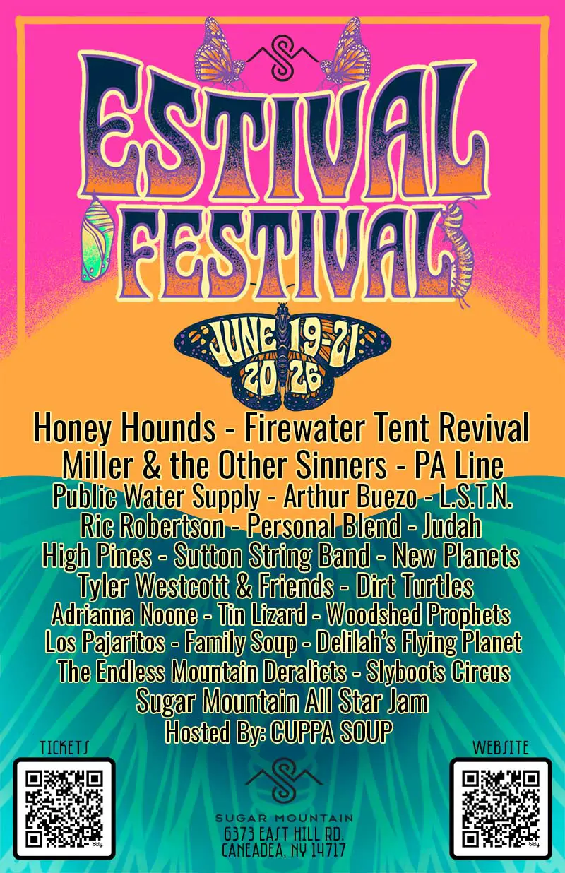 Estival Festival announced its 2026 lineup, featuring at least 25 regional artists performing across three stages Thursday, June 19 through Saturday, June 21 at Sugar Mountain in Caneadea. The festival, hosted by Cuppa Soup, takes place at 6373 East Hill Road in Allegany County.