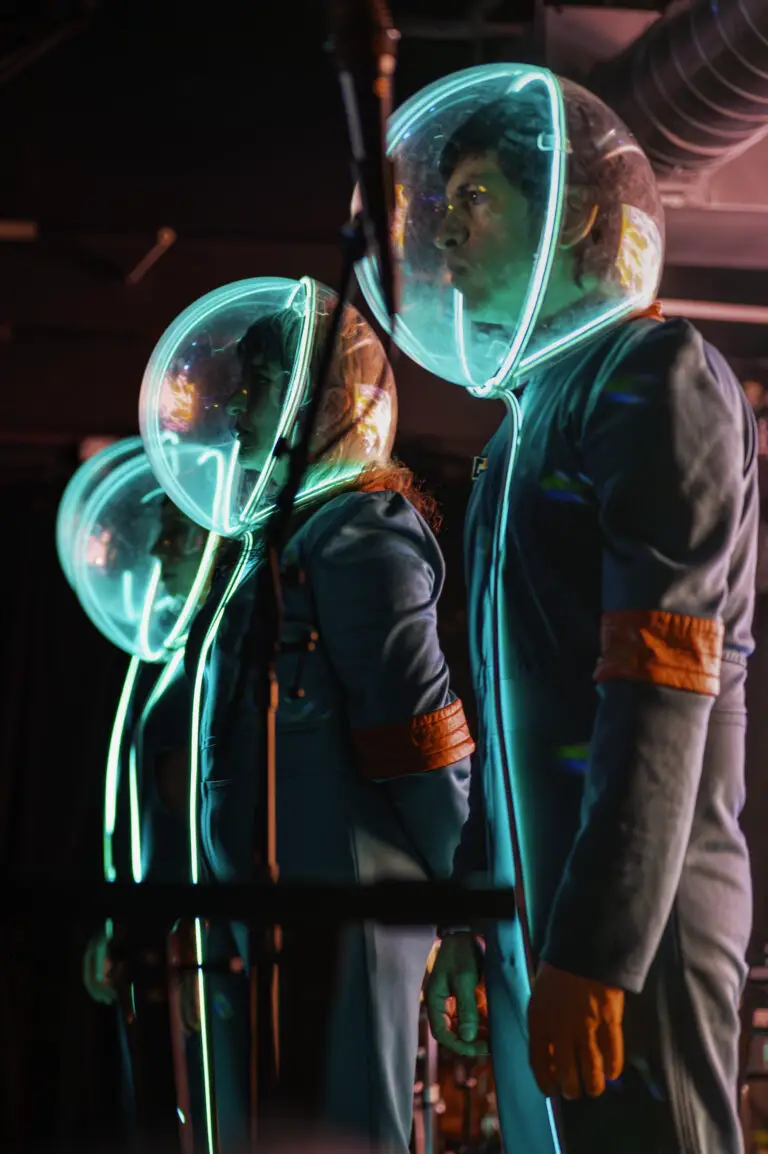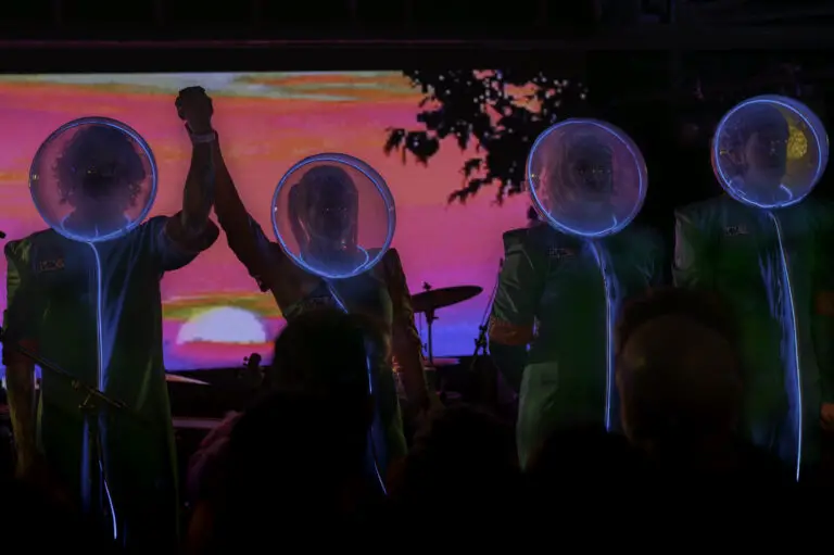 As an 80s looking computer was rolled onto the stage, the unknowing were confused and you could see it in the eyes of the crowd as the set up for Descartes A Kant was starting to take form in front of their eyes. The entire venue was transformed into, what seemed like, an Atari game, the background gave prompt questions like, “Do you choose destruction or to create?,” which then lead into the next song. In unison, the members on Descartes A Kant donned glowing space helmets and suits to add to their unique style and as their set came to a close, destruction was chosen by the computer as smoke started to pour out of it and our band “took off” from this reality, the entire venue in shock over what just took place.