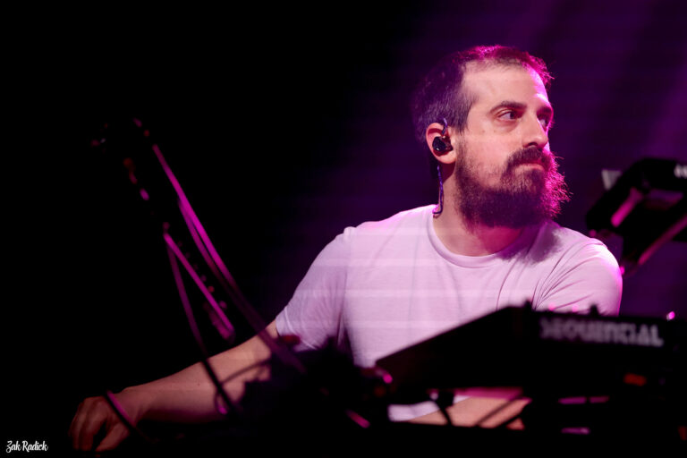 The second set began with our first cover of the night. Returning to the stage with “Anyone,” originally recorded by Demi Lovato, Schectman immediately launched into a swirling synthesizer barrage that transformed the emotional pop ballad into a pulsing EDM dance floor. Samples ricocheted across the room while Tkachyk’s SPD-SX drum pad added glitchy rhythmic accents. Playing his custom hollow-body guitar “The Crow,” crafted by Arizona luthier Andrew Thomas, Moss delivered a performance filled with sincerity and aching melodic phrasing. Despite lyrics that suggest doubt if anyone was really listening, the truth was obvious. The entire room was and they were completely locked in and hanging on every note. But the real centerpiece of the second set arrived next in the form of “Dirtbath.”