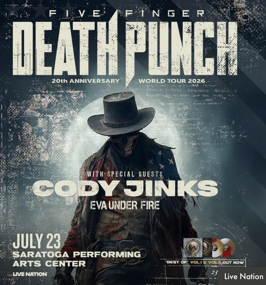 Five Finger Death Punch is a chart-topping hard rock band, known for their energetic and striking music. The band will perform on Thursday, July 23rd, at 6:45pm, along with special guests Cody Jinks & Eva Under Fire at the Albany Med Health System at SPAC Live Nation.