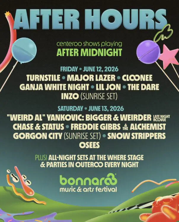 Late nights at Bonnaroo will also have nightly Outeroo parties, as well as all-night sets at the fan-favorite Where Stage, which will be relocating directly to Centeroo. This stage will see performances from Eazybaked, Lumasi, Mary Droppinz, and many more.