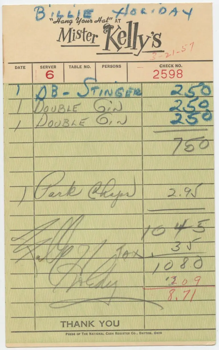 Among the standout items is a signed 1957 bar receipt from Billie Holiday, offering a strikingly personal glimpse into the life of the jazz legend. Dated March 21, 1957, during her two-week engagement at Chicago’s famed Mister Kelly’s, the receipt captures a late-night order — a pork chop and three double cocktails — and bears Holiday’s pencil signature. More than a novelty, the piece is an evocative snapshot of the artist offstage, revealing a fleeting, human moment during the final years of her career, just two years before her death in 1959.